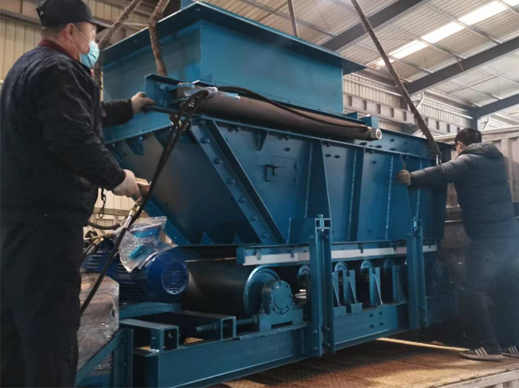 2022年1月5日,由山東礦安機電生產(chǎn)的變頻液壓甲帶給煤機在倉庫裝車,發(fā)往山西晉中。
